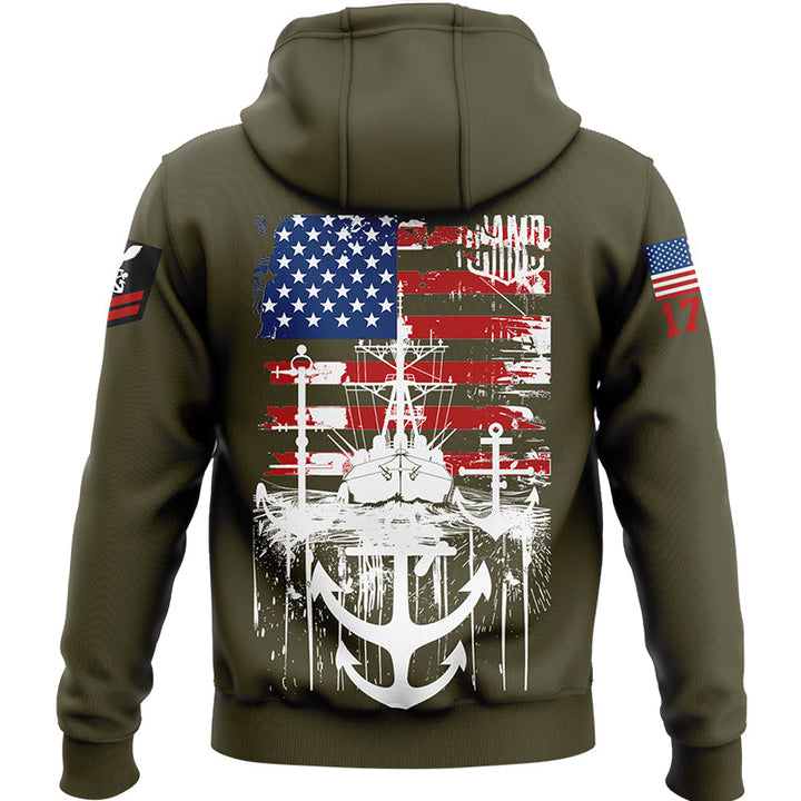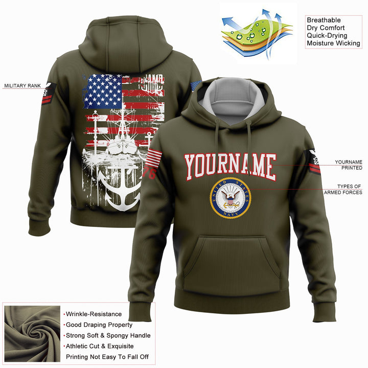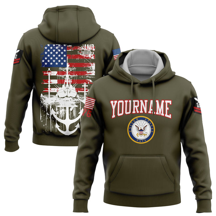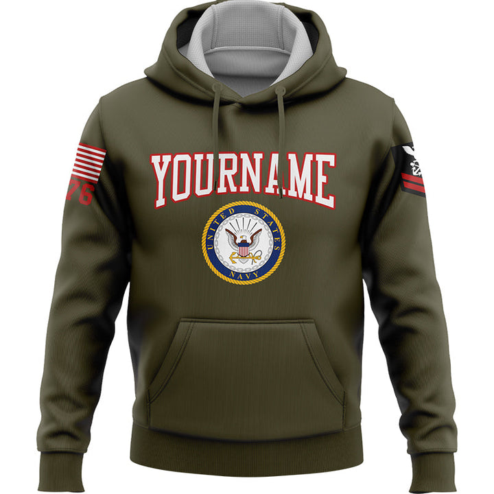 Custom Olive Warship 1776 American Flag U.S Navy Military Rank Name Hoodie