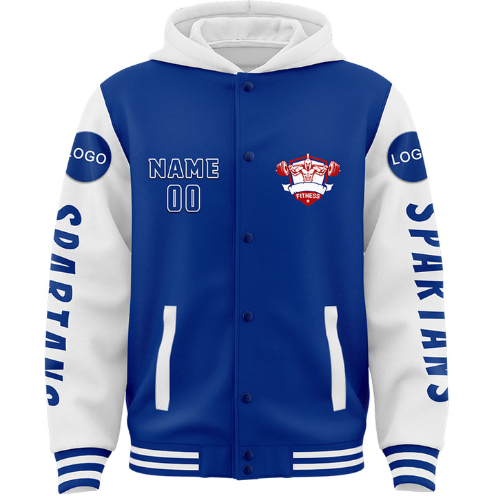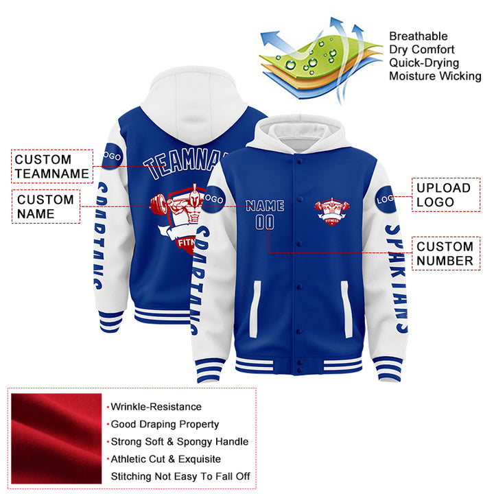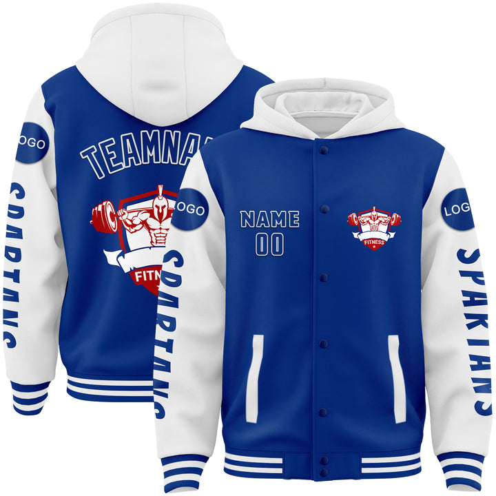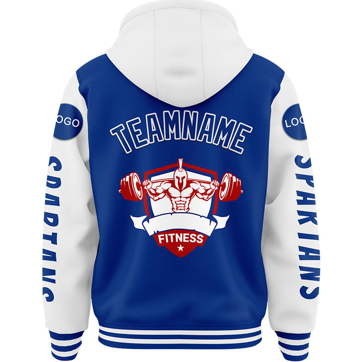 Custom Royal White Spartan Fitness Barbell Squat Bomber Full-Snap Varsity Letterman Two Tone Hoodie Jacket