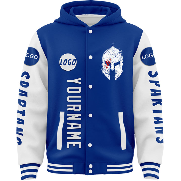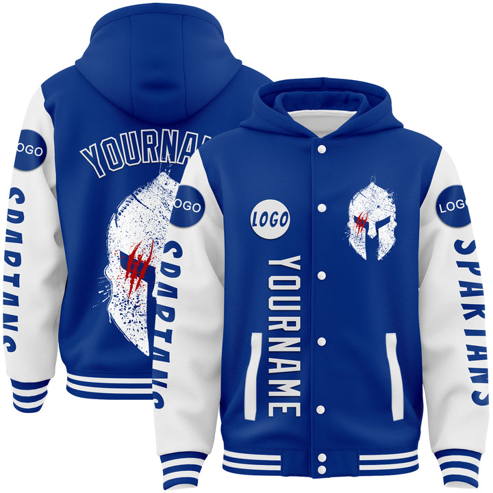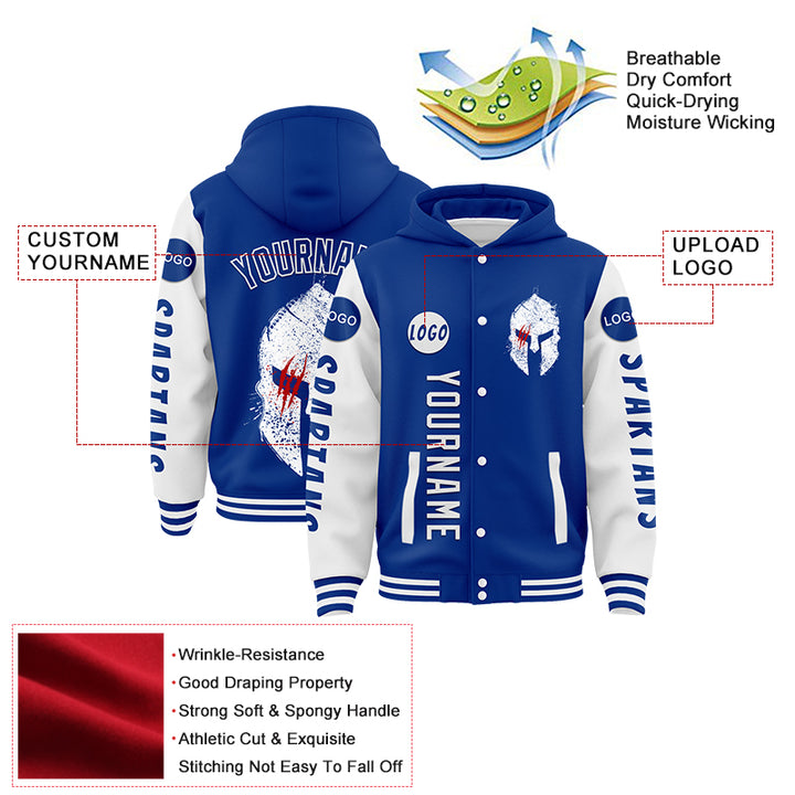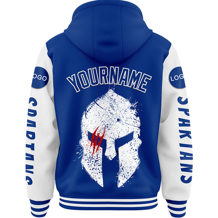 Custom Royal White Spartan Scratches Bomber Full-Snap Varsity Letterman Two Tone Hoodie Jacket
