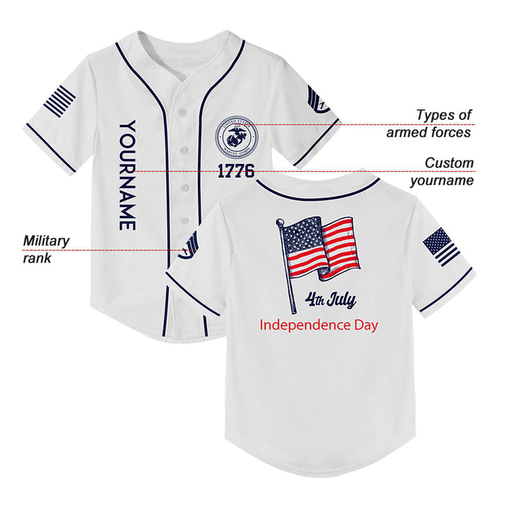 Custom White 4th July American Flag Military Rank Name Independence Day Baseball Jersey