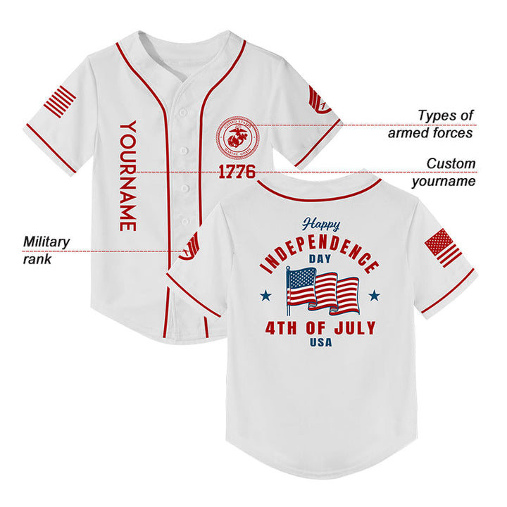 Custom White 4th Of July American Flag Military Rank Name Independence Day Baseball Jersey