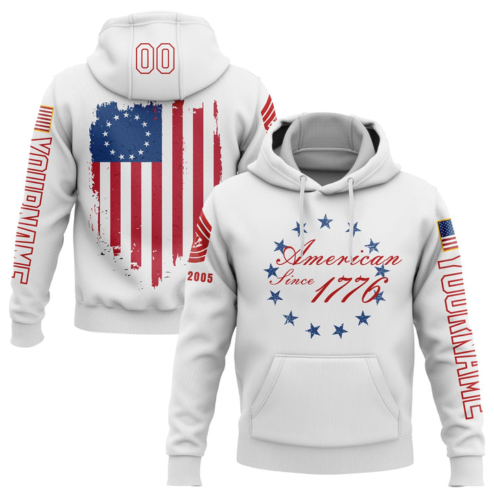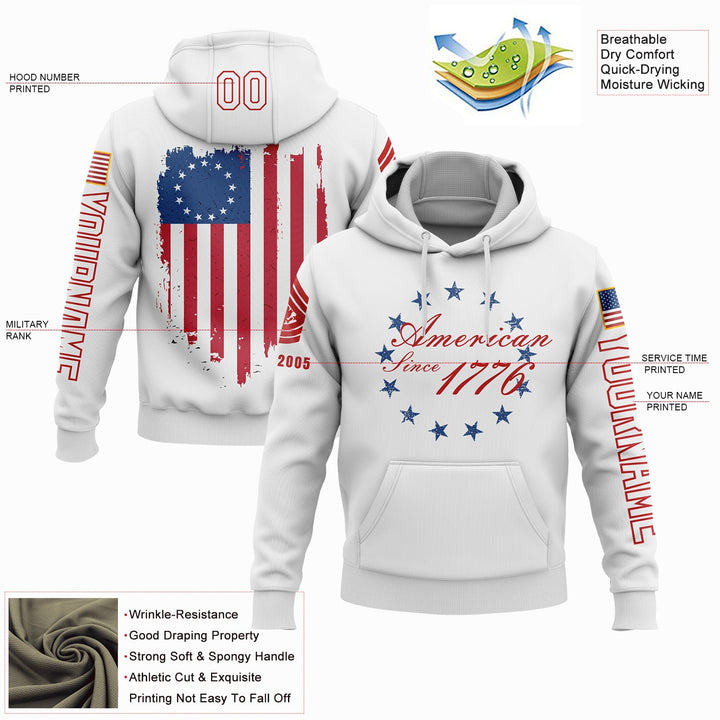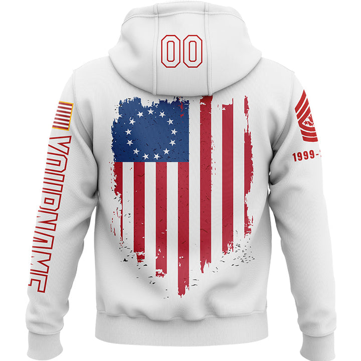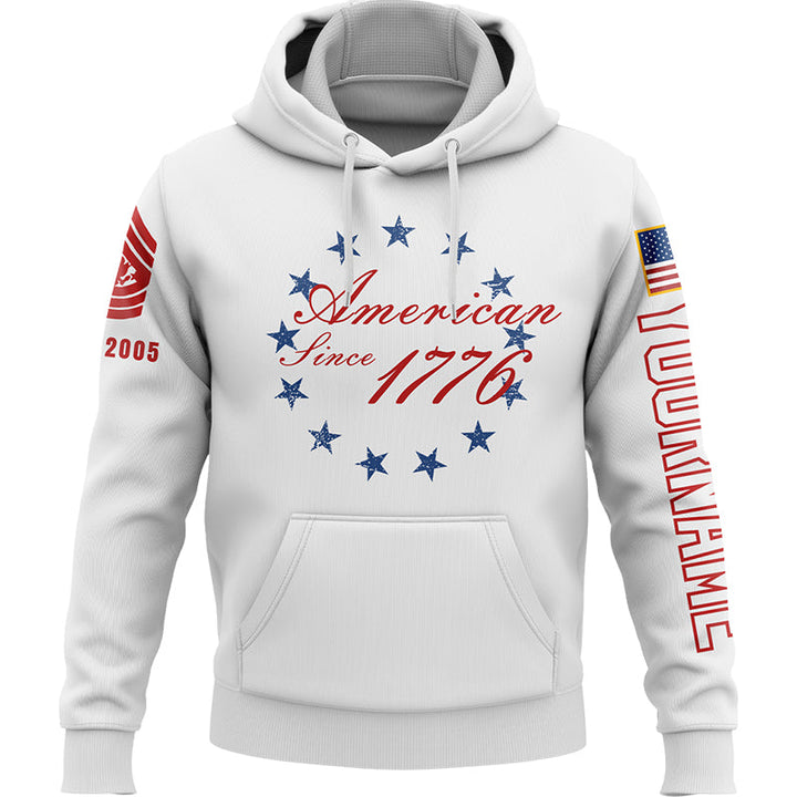 Custom White America Since 1776 Flag Military Rank Veteran Name Hoodie
