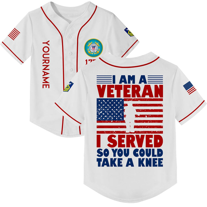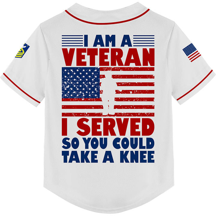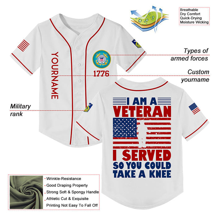 Custom White I'M A Veteran I Served So You Could Take A Knee 1776 Flag Military Rank Name Veterans Day Baseball Jersey