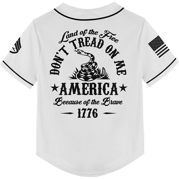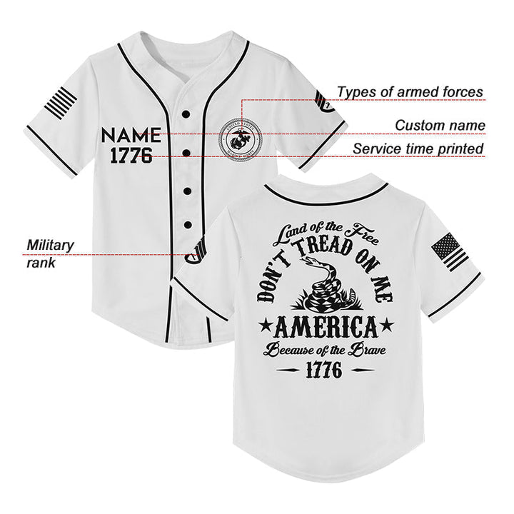 Custom White Land OF The Free Don't Tread On Me America Because Of The Brave 1776 Military Rank Veteran Name Baseball Jersey
