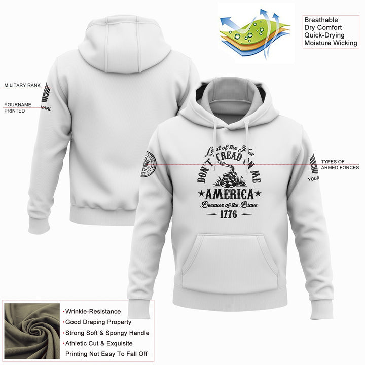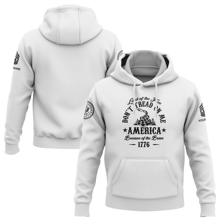 Custom White Land OF The Free Don't Tread On Me America Because Of The Brave 1776 Military Rank Veteran Name Hoodie