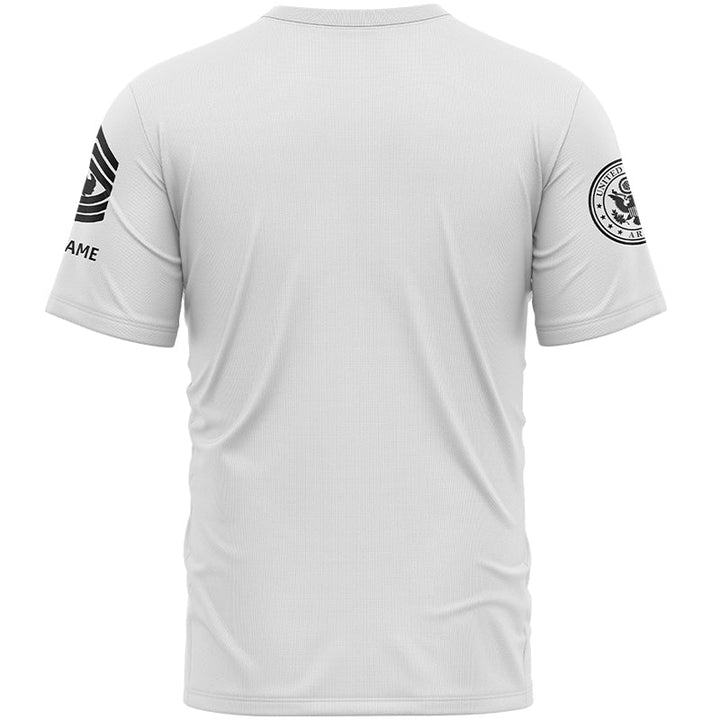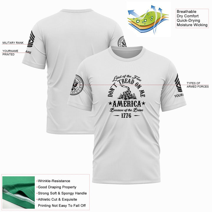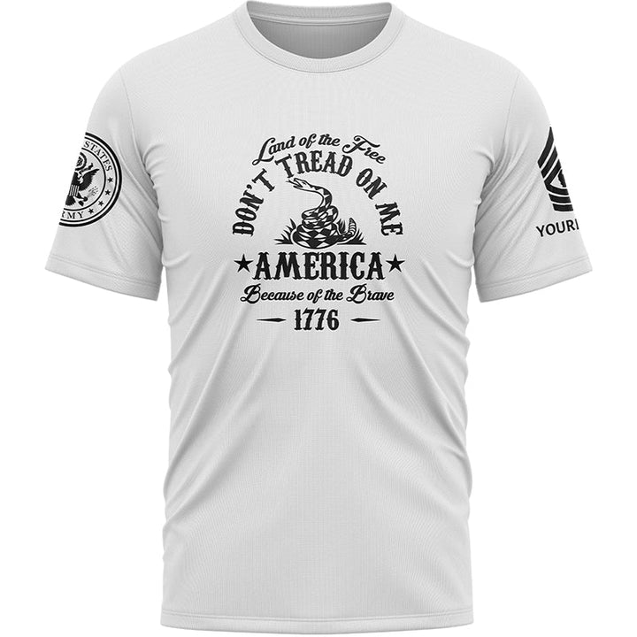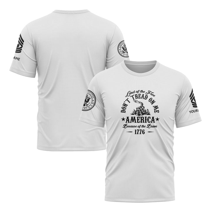 Custom White Land OF The Free Don't Tread On Me America Because Of The Brave 1776 Military Rank Veteran Name T-Shirt