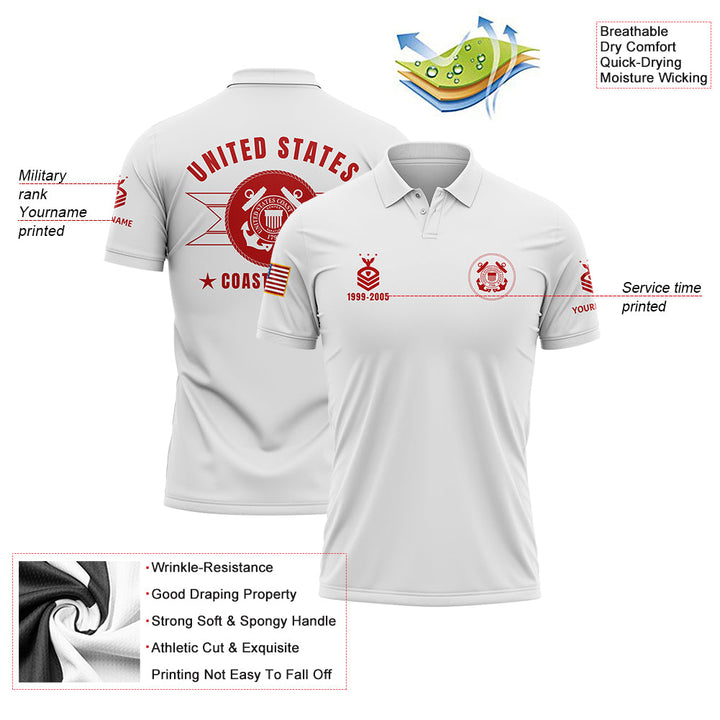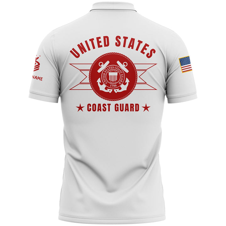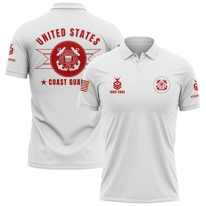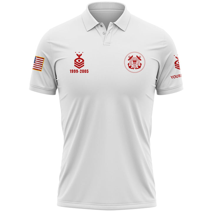 Custom White U.S Coast Guard Military Rank Veteran Name Golf Polo Shirt