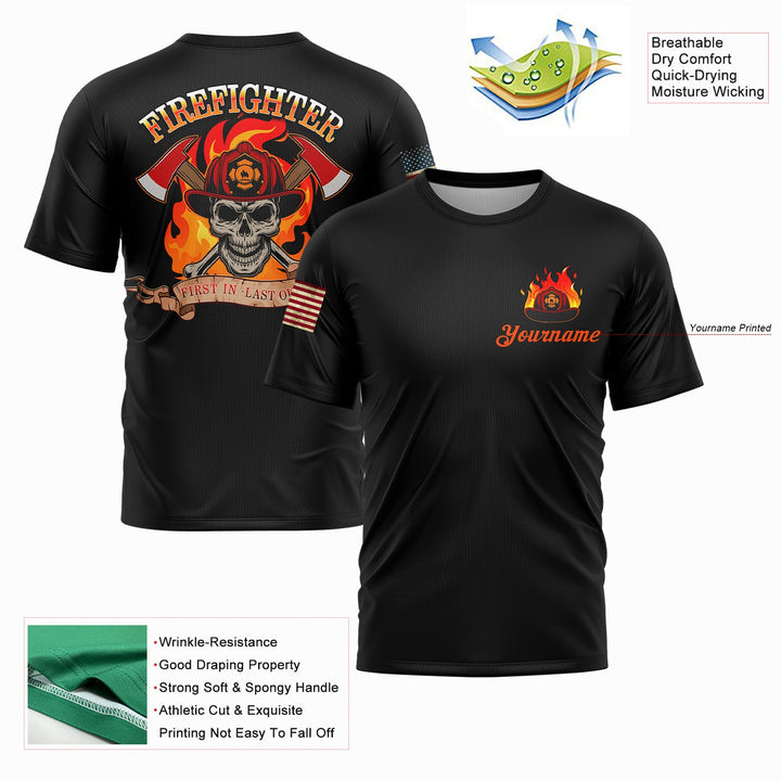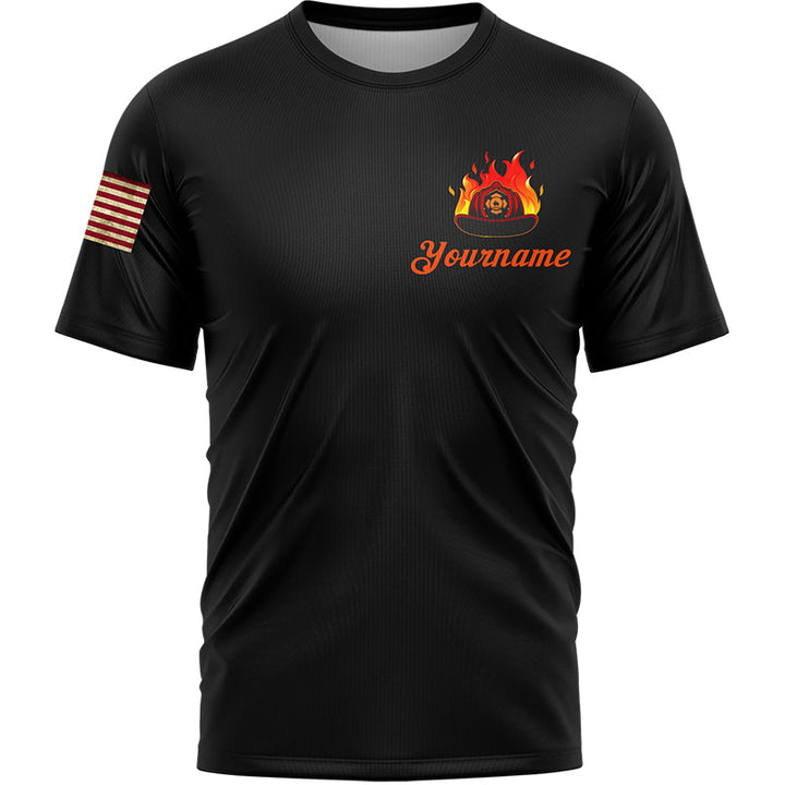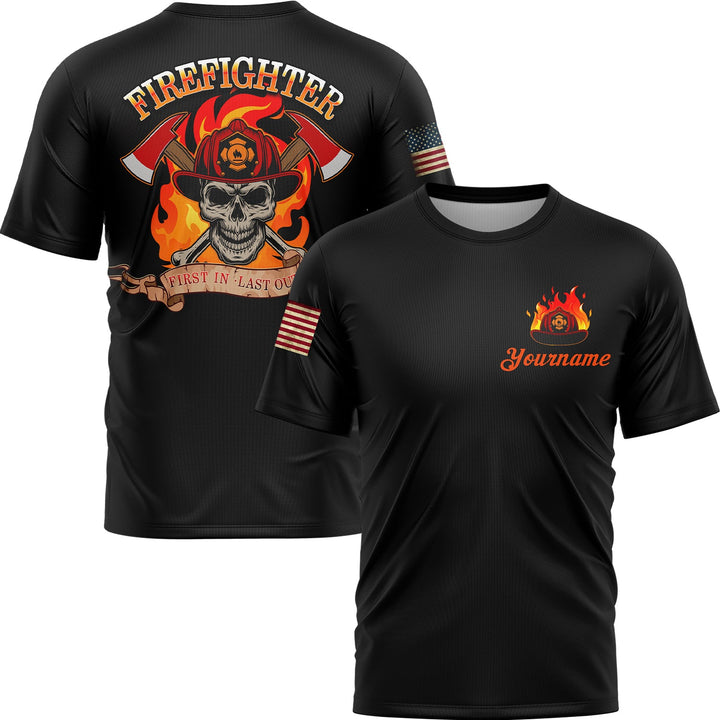 Firefighter First In Last Out Custom Black American Patriot Name T-Shirt