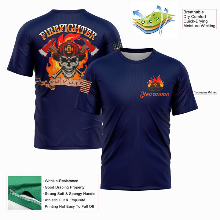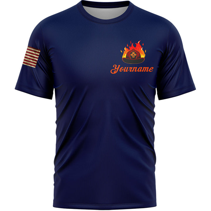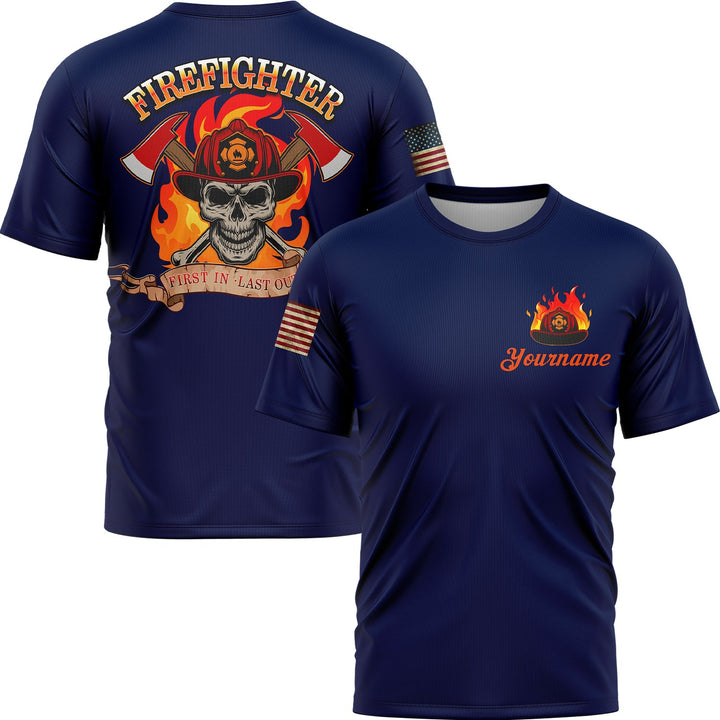 Firefighter First In Last Out Custom Navy American Patriot Name T-Shirt
