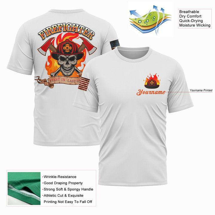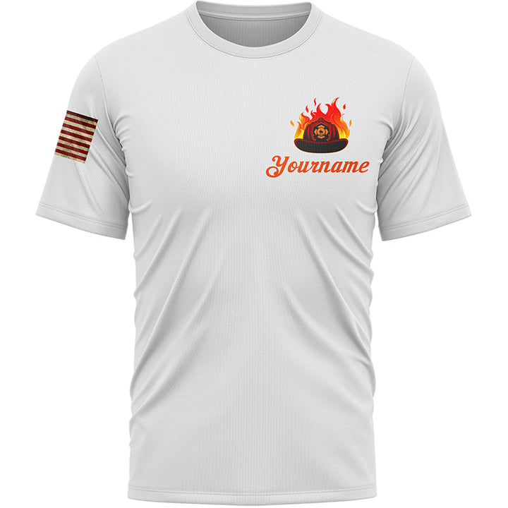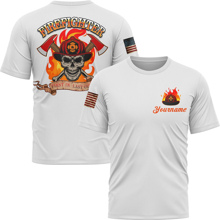 Firefighter First In Last Out Custom White American Patriot Name T-Shirt