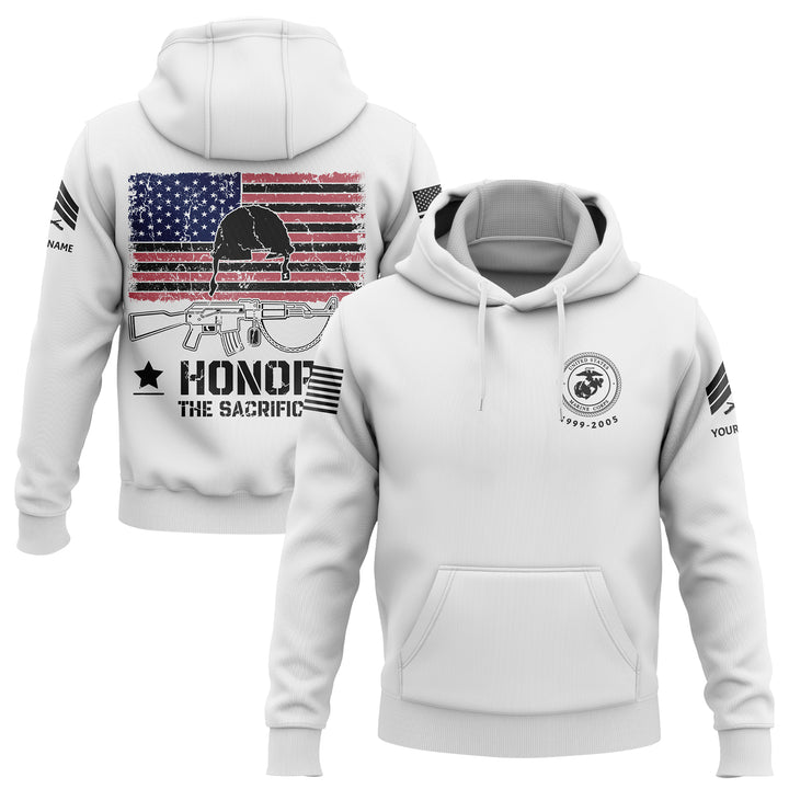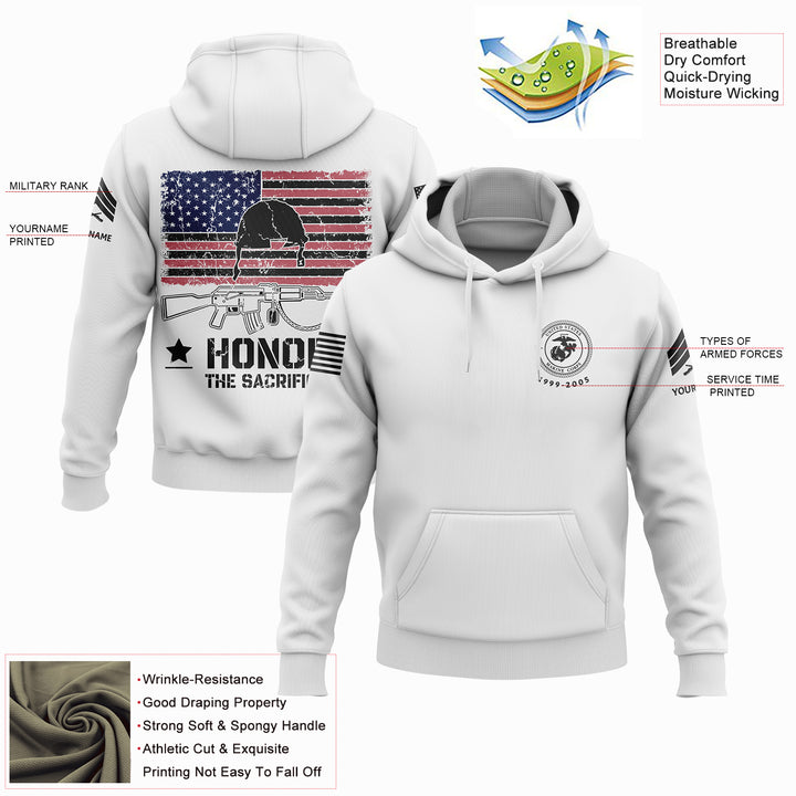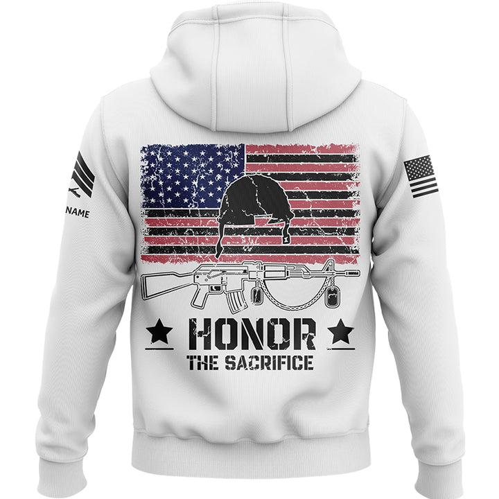 Honor The Sacrifice Custom White American Flay Military Rank Veteran Name Memorial Day Hoodie
