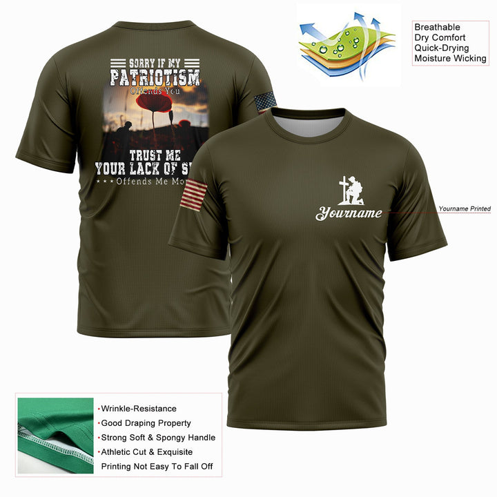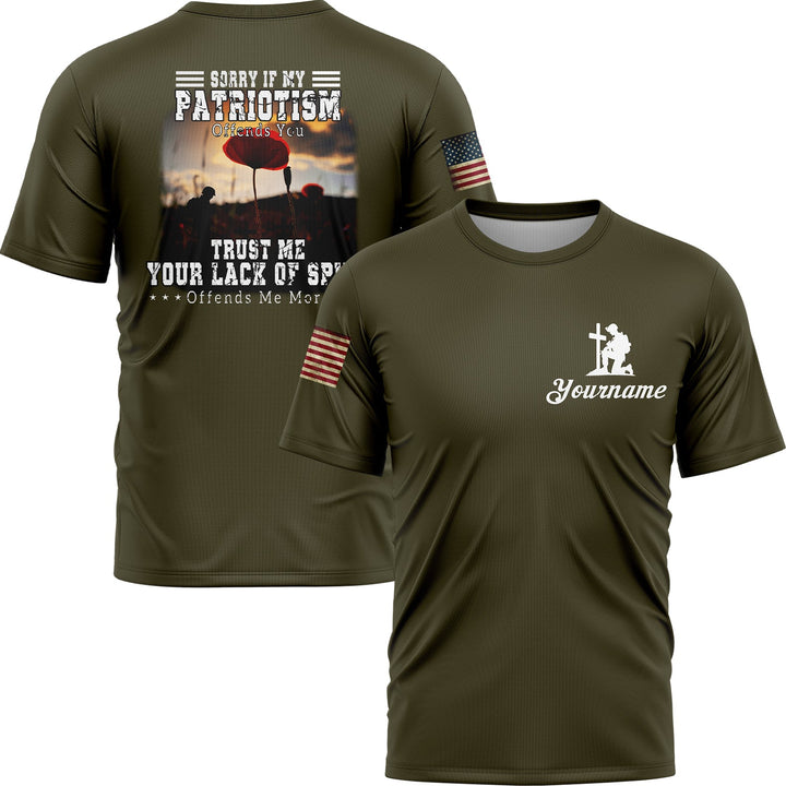 Sorry If My Patriotism Offends You Trust Me Your Lack Of Spine Offends Me More Custom Olive American Patriot Name T-Shirt