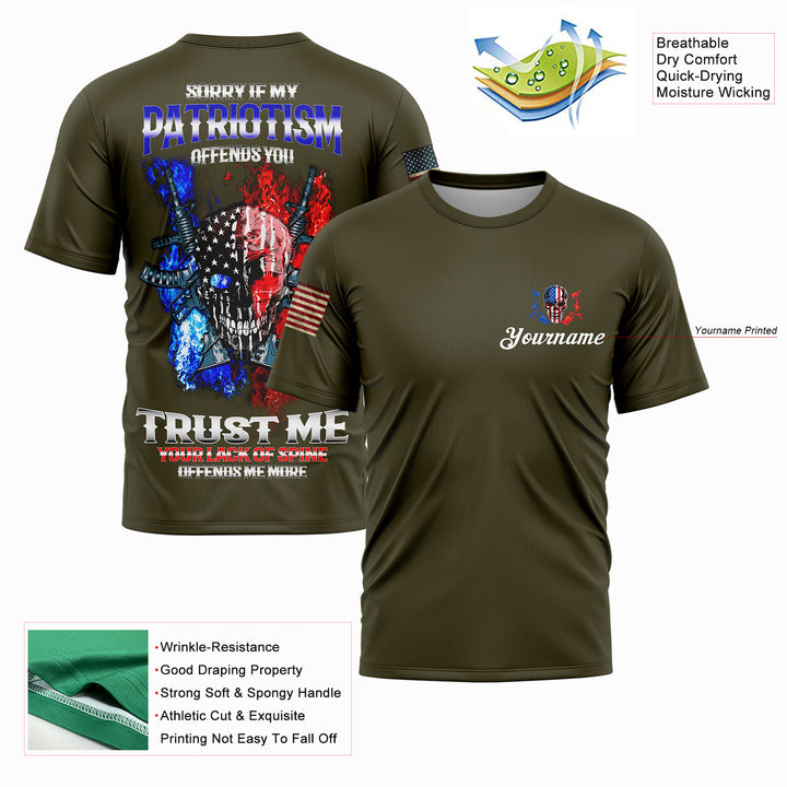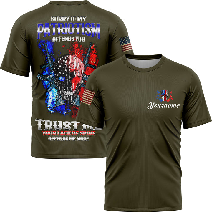 Sorry If My Patriotism Offends You Trust Me Your Lack Of Spine Offends Me More Custom Olive American Patriot Name T-Shirt