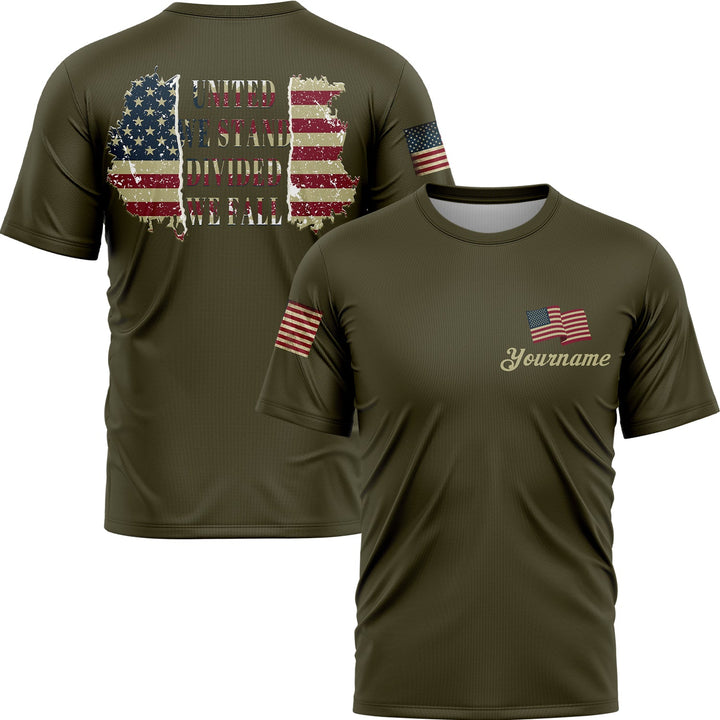 United We Stand Divided We Fall Custom Olive American Patriot Name T-Shirt