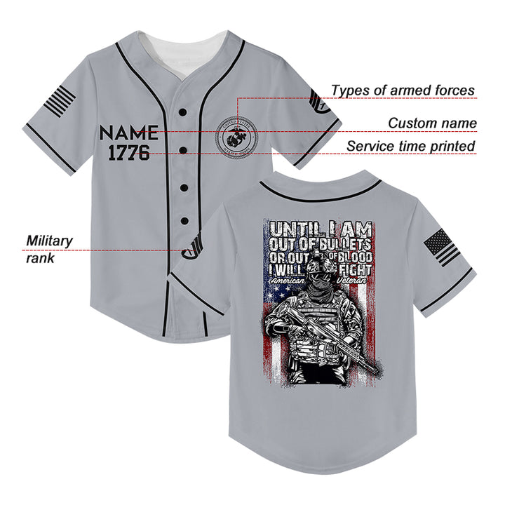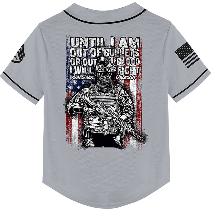 Until I Am Out Of Bullets Or Out Of Blood I Will Fight Custom Grey American Military Rank Veteran Name Baseball Jersey